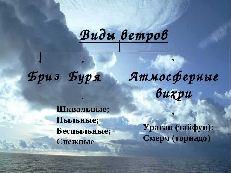 Сильный ветер — это движение воздуха относительно земной поверхности со скоростью свыше 14 м/с. При дальнейшем усилении ветра возникают бури, ураганы, шквалы, смерчи.
