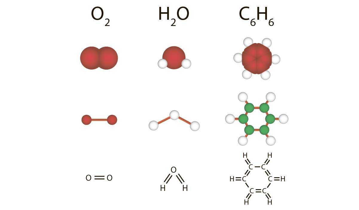 Молекула может быть гомоядерной, то есть состоять из атомов одного химического элемента, как из двух атомов в молекуле кислорода (O2); или она может быть гетероядерной, химическим соединением, состоящим из более чем одного элемента, как в случае с водой (два атома водорода и один атом кислорода; H2O).