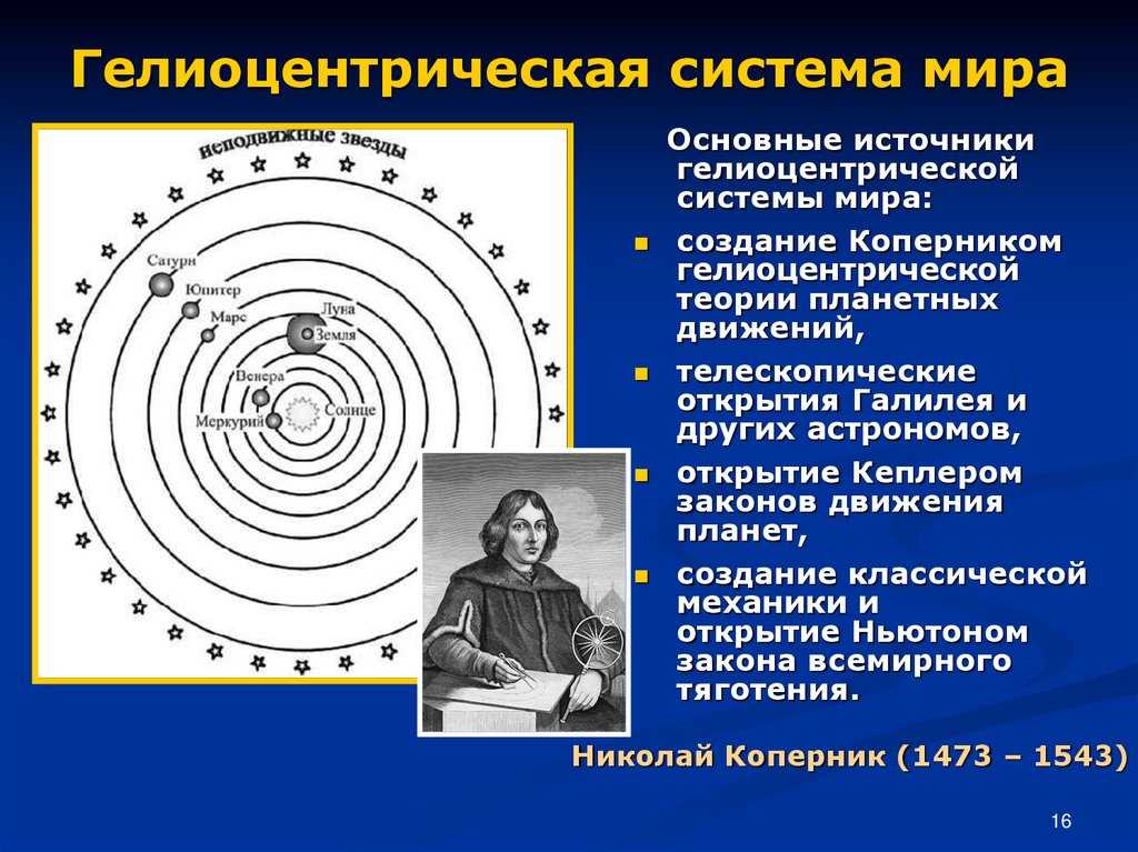 Гелиоцентрическая картина мира. Гелиоцентрическая система мира — представление о том, что Солнце является центральным небесным телом, вокруг которого обращается Земля и другие планеты. Противоположность геоцентрической системе мира. Возникло вантичности, но получило широкое распространение с конца эпохи Возрождения.