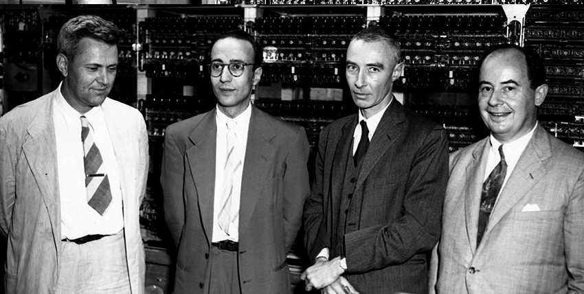 Джулиан Бигелоу, Герман Гольдштейн, Роберт Оппенгеймер и Джон Фон Нейман перед машиной MANIAC
