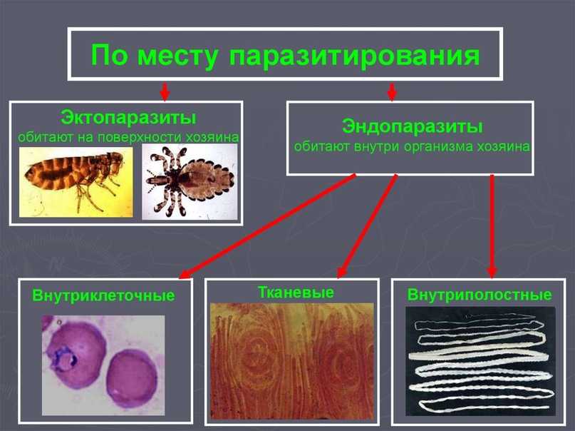 Эктопаразиты – это паразиты, которые живут за пределами тела хозяина, такие как вши и клещи. Эндопаразиты, такие как нематоды и нематоды, живут внутри хозяина. Мезопаразиты попадают во внешние отверстия хозяина, такие как наружное ухо или клоака.