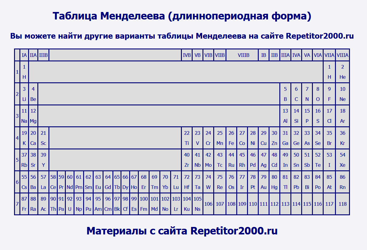 | Iа | IIа | IIIб | IIIб: лантаноиды и актиноиды | IVб | Vб | VIб | VIIб | VIIIб | Iб | IIб | IIIа | IVа | Vа | VIа | VIIа | VIIIа | ||||||||||||||||