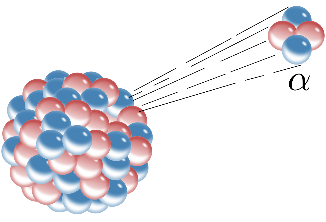 Одна из разновидностей нуклонной эмиссии, вследствие которой массовое число ядра снижается на четыре, атомный номер – на два и образуется поток заряженных атомов гелия. Присущ для тяжёлых элементов с атомным номером от 52 с массовым числом от 106. Элементы, начиная из свинца при массовом числе от 200 (за редким исключением), обладают α-радиоактивностью. У части из них α-распад не является основным видом расщепления. Наблюдается он и у лёгких атомов – литий-7, гелий-5, бериллий-6.