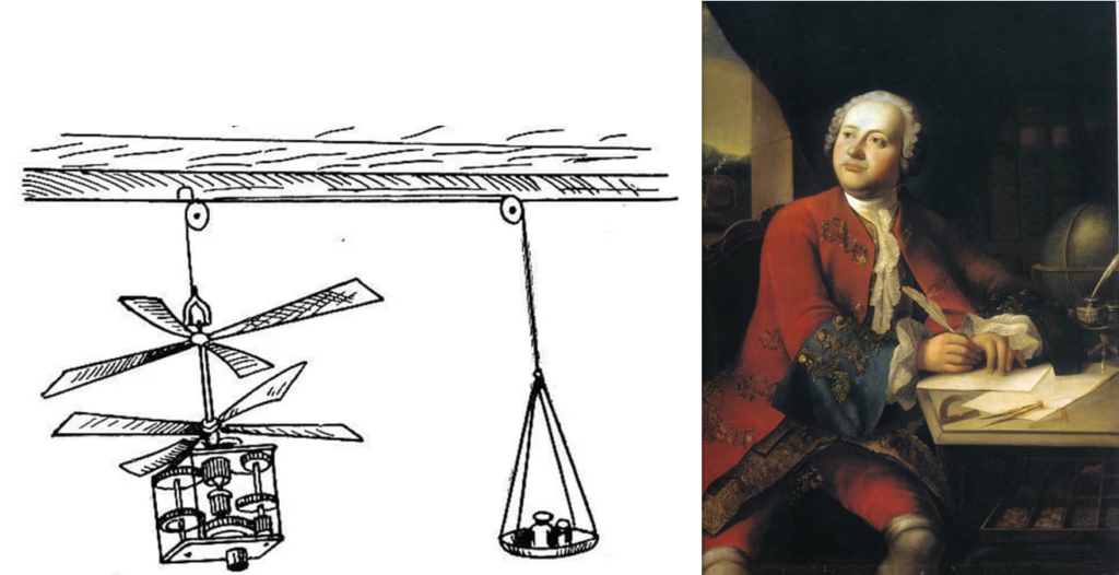 В XVIII веке первый русский учёный и академик Михаил Ломоносов предложил построить вертикально взлетающий аппарат для исследования атмосферы. Аппарат должен был поднимать приборы — например, термометр. До нас дошло описание такого устройства Ломоносова, но никаких рисунков не осталось.