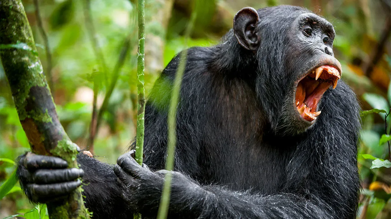 Самец шимпанзе демонстративно зевает, обнажая клыки, чтобы показать свою власть перед более старым самцом (слева). Животные низшего ранга (самка с детенышем справа) внимательно наблюдают за поведением лидера.