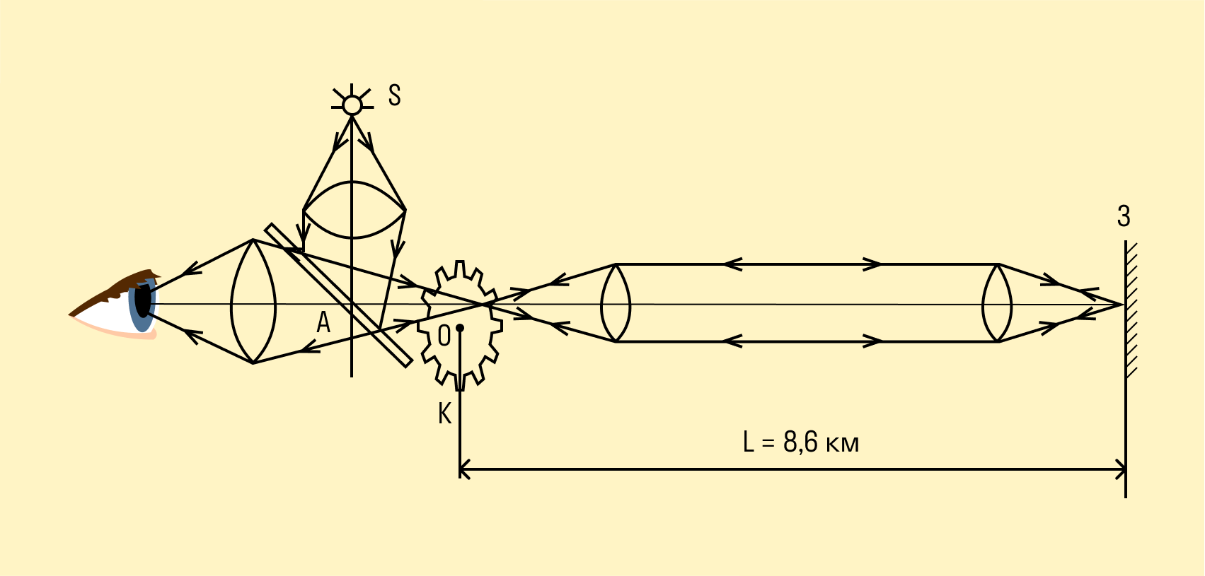 В начале XIX века французский ученый Физо разработал для измерения скорости света так называемый метод прерываний. Физик направил луч света на зеркало. Отражаясь от него, свет проходил через зубцы колеса. Затем попадал на еще одну отражающую поверхность, которая была расположена на расстоянии в 8,6 км. Колесо вращали, увеличивая скорость, пока луч не будет видно в следующем зазоре. После подсчетов Физо получил результат — 313 000 км/с.