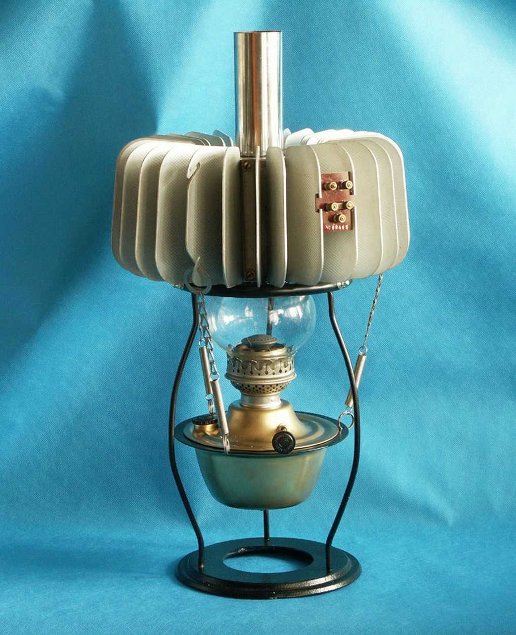 Представленная на фото керосиновая лампа окружена абажуром термоэлектрического генератора разработана под руководством Иоффе. Это изделие постсталинских времён, датированное 1959 годом, позволяет одновременно слушать радио и записывать секретные сводки. Истинный друг подпольного работника. Термоэлектрический генератор выдаёт напряжение для нагрева нитей накала амплитудой 1,5 В при силе тока 125 мА, питает все устройство напряжением 90 В при токе 12 мА.