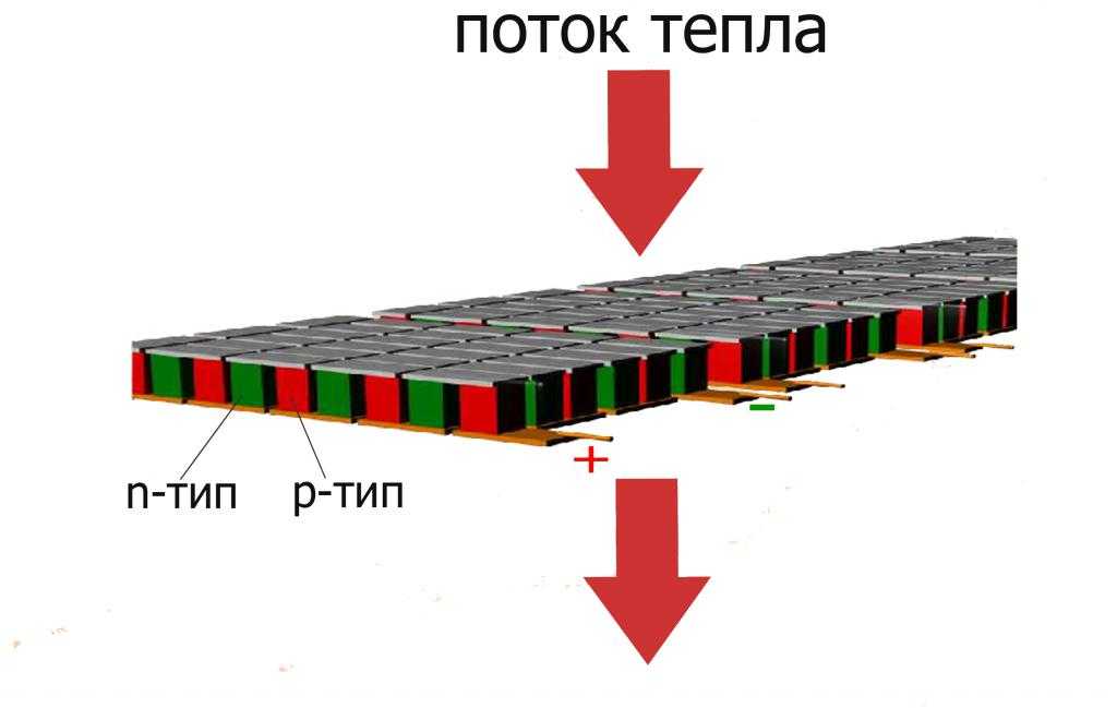 Термоэлектрический эффект заключается в следующем явлении. Для охлаждения или генерации электричества используется «модуль» состоящий из электрически связанных пар. Каждая пара состоит из полупроводникового материала р (S> 0) и n (S