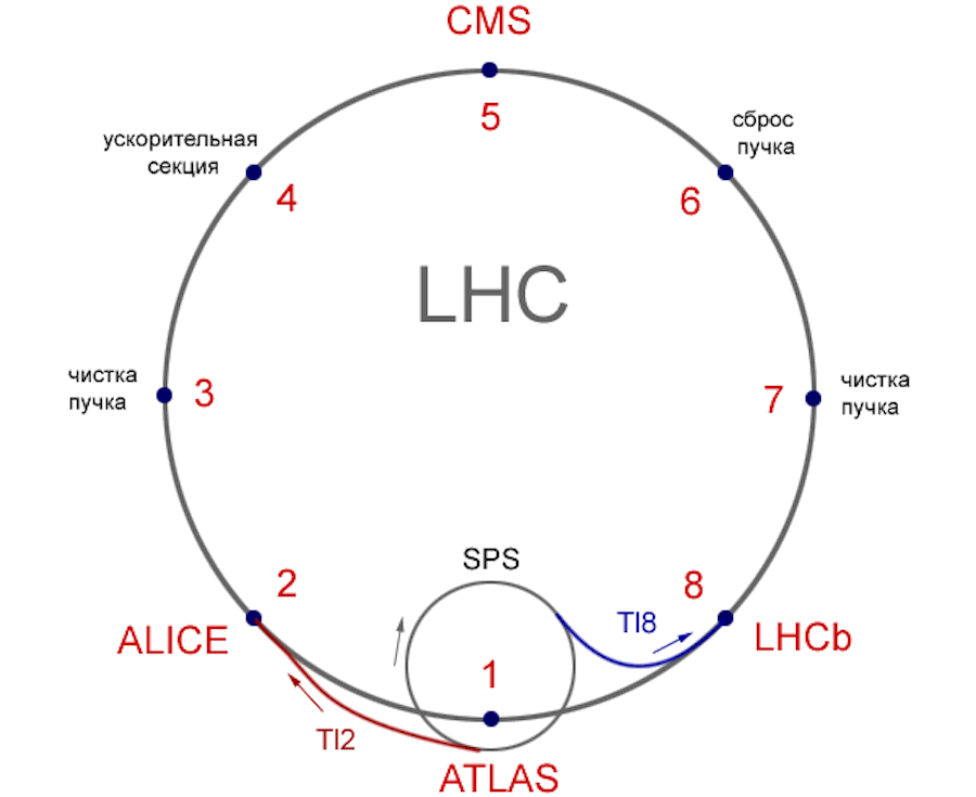 Пучки частиц поступают в Большой адронный коллайдер из предварительного ускорителя SPS — протонного суперсинхротрона, который их формирует, а затем впрыскивает в специальный отсек БАК. Внутри коллайдера протоны начинают циркулировать в противоположных направлениях по двум вакуумным трубам. По мере своего движения они пролетают через следующие установки ускорительного кольца: