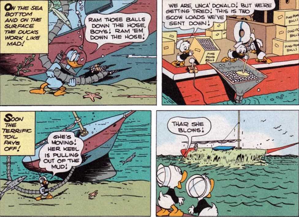 Дональд Дак поднимает со дна яхту при помощи шариков для пинг-понга. Walt Disney Corporation, 1949